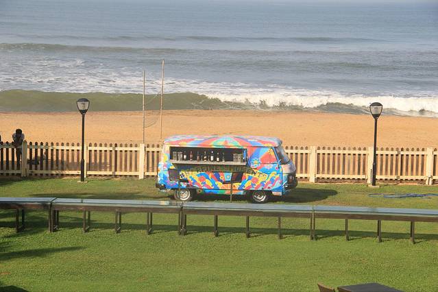酒店门口的沙滩和酒店的餐吧车
