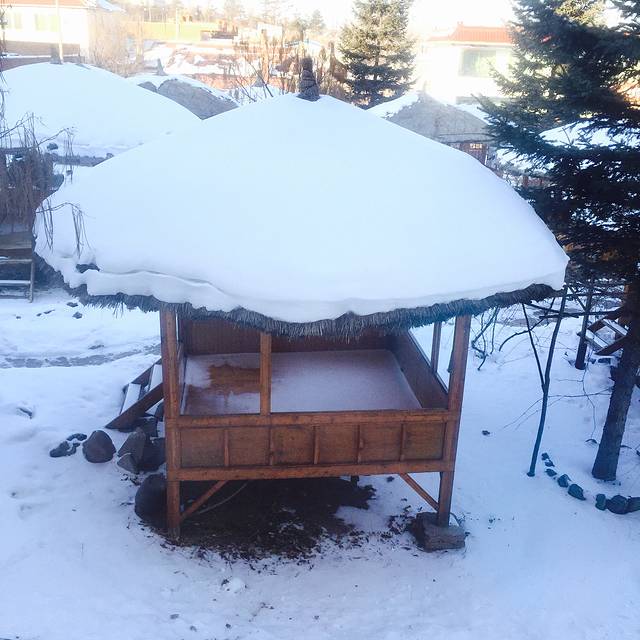 到了朝鲜民俗园,人好少,店铺都关门了,可是南方朋友见到雪是极激动的,没有进到民俗园里也玩的很欢脱。