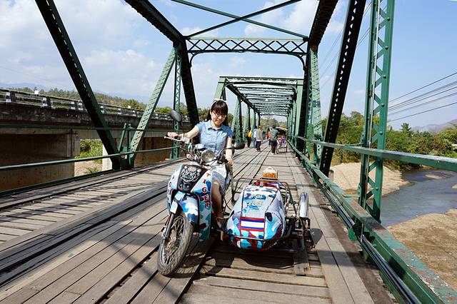 桥上供游人拍照的车辆都是收费的。大家只需要把钱投到车子上设置的投币箱里就可以了。小驴也不免在二战时日军常见的车辆上凹个造型。