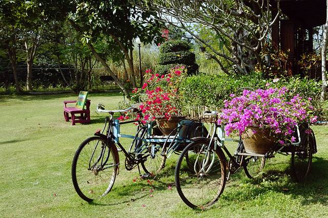 拜县的每一处景致都是那么富有创意与温情。被漆成奶白色与Tiffany蓝的破旧三轮车,搭配上大株绚烂的三角梅盆栽,瞬间点亮了整片空荡荡的草坪。