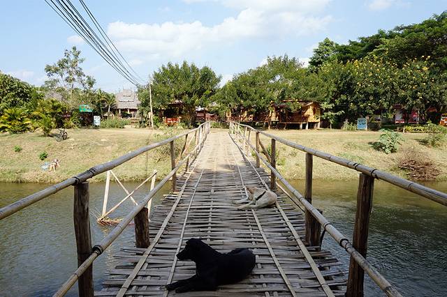 不知不觉走到了拜河河边,简约的竹桥吱吱作响,总会让人感到一丝不安。桥上一黑一白两只狗狗卧在阴凉处休息,丝毫不在意桥上来往的行人。河对岸的度假酒店很是热闹,尽是些来此享受生活的西方面孔。看,对面的草地上还躺了一个穿着泳衣晒日光浴的女士!