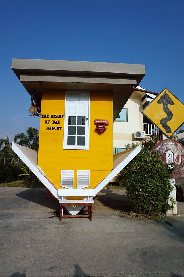 在拜县之心度假村的倒立小黄房子,遇见错乱的世界。上面还倒挂了一辆破旧生锈的自行车。除此之外,并没有什么特别之处。