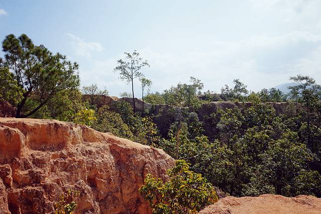 许是植被茂盛的缘故吧!拜县大峡谷看上去并没有那么的纵深险峻。但在异常狭窄的岩面坡道上行走,没有任何保护措施,着实惊险刺激。