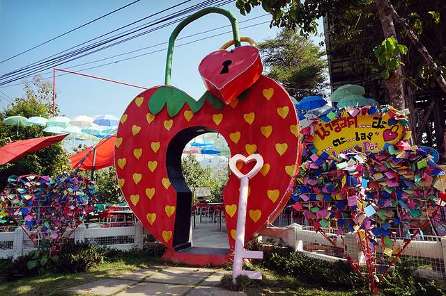 在草莓同心锁旁,用彩色卡片记录下情人间永恒的情话,诉说如草莓般甜蜜且酸涩的爱情。
