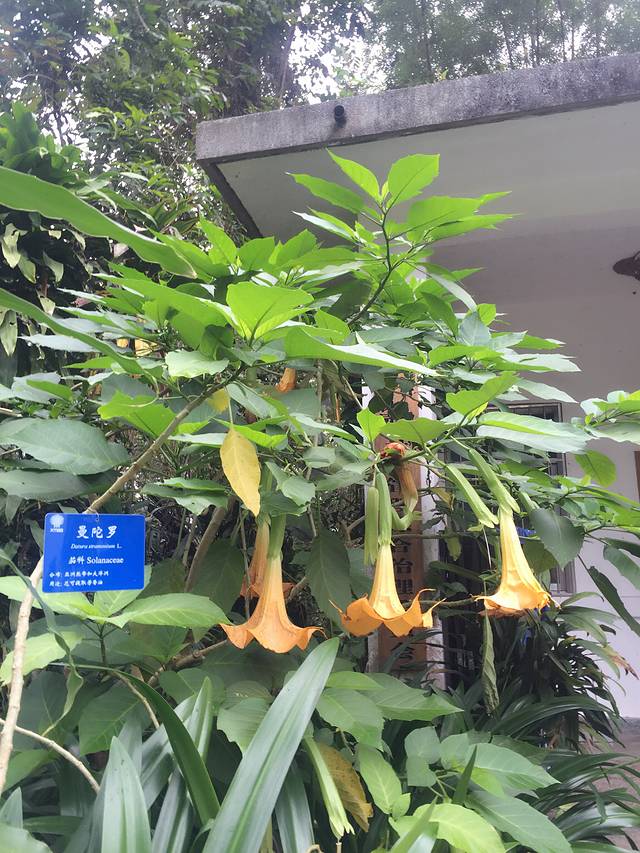 早上下起了小雨,有点冷,植物园里需要坐电瓶车,40人一位,需要单独收费,有学生证的一定要带上。我们的导游陈猫人很好。这里需要讲一下,傣族人管帅哥叫猫哆哩,美女叫骚哆哩。你好,mengli,谢谢,yingli,再见,guaihan。当地人都是这么称呼的。现在是版纳的冬天,虽然比北方暖呵很多,但很多植物都没有开花,一片绿,表示没什么好看的,我们跟着陈猫了解了一下当地的树木。还见到了曼陀罗花,这个有剧毒,里边的植物最好都不要碰,小心见血封喉!!!