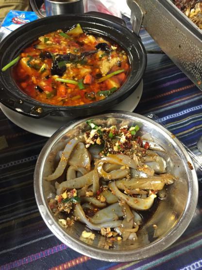 这是客栈老板经常来吃的一家饭馆,去吃了下,确实不错,by the way,这里的茶水真的很好喝,茶叶用量足,且特别清新,满满的一壶,不像北京什么的地方用的只有茶叶末,差距啊。炒菜的味道有些像重庆小吃,很不错,俺很喜欢。吃饭时裤子被太阳晒着,差一点就着火了,太特别了