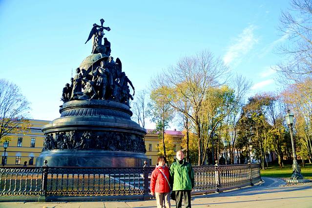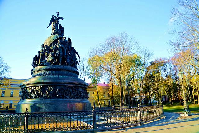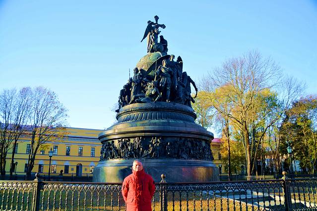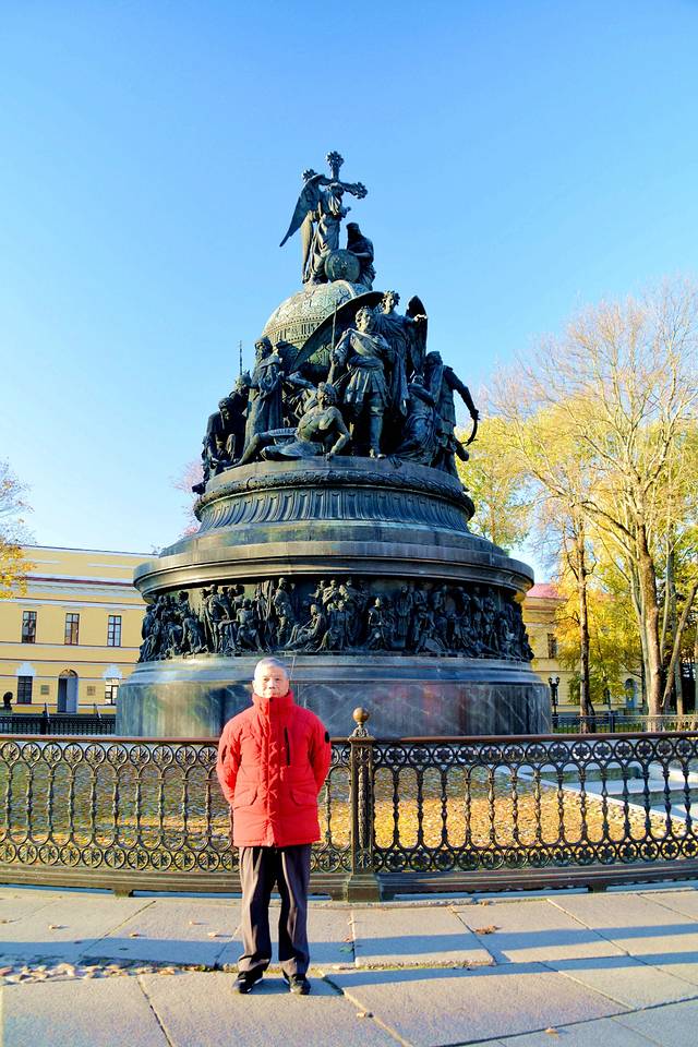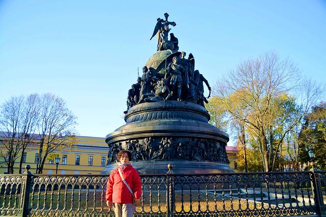 这是千年俄罗斯纪念碑。为纪念留里克即位1000周年,1862年建造了这一千年俄罗斯纪念碑。纪念碑周围,排列着点缀俄罗斯历史的统治者、英雄、文化名人等颇具特征的雕像。位于中间位置、面向南方的持盾士兵,就是留里克其人。目光向左移,依次是弗拉基米尔大公、彼得大帝、伊凡大帝以及最早击败鞑靼人的德米特里·顿斯科伊,共有6个历史人物。