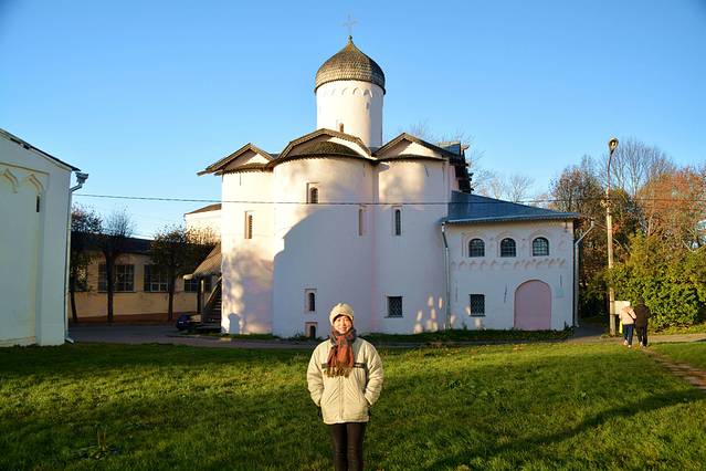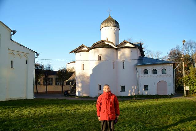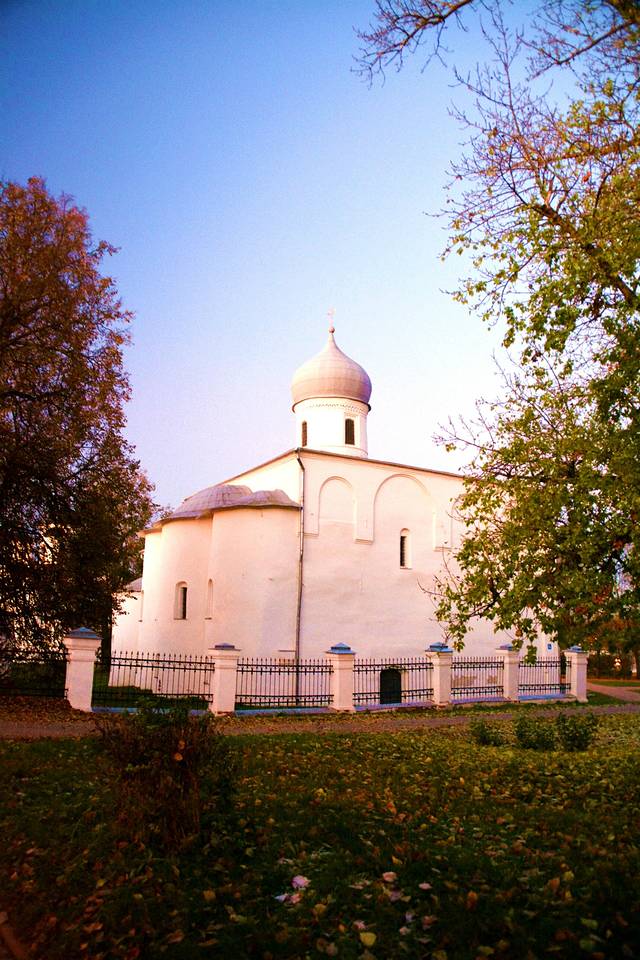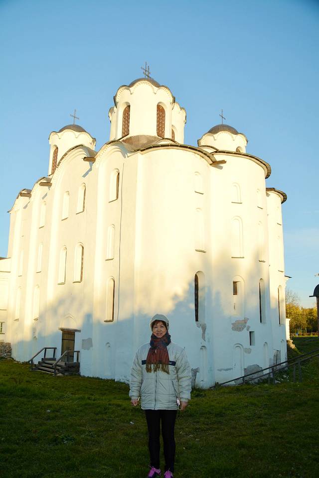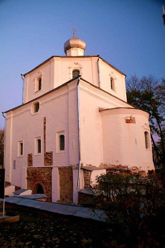 这座砖瓦色教堂是叫母神教堂,建造于1207年。其中央穹顶两侧残存也有水彩壁画,这也十分难能可贵。道路对面的“市场上的格奥尔吉教堂”,是17世纪的建筑物,今天为收集有古代诺夫哥罗德城镇照片的展示室。