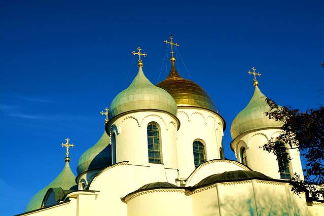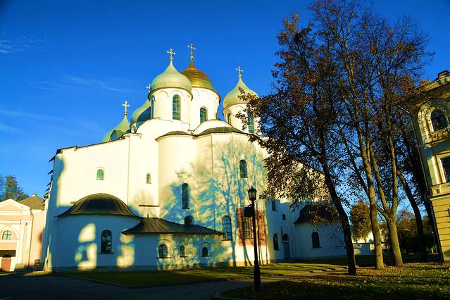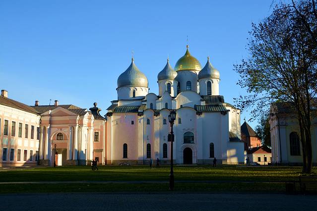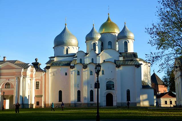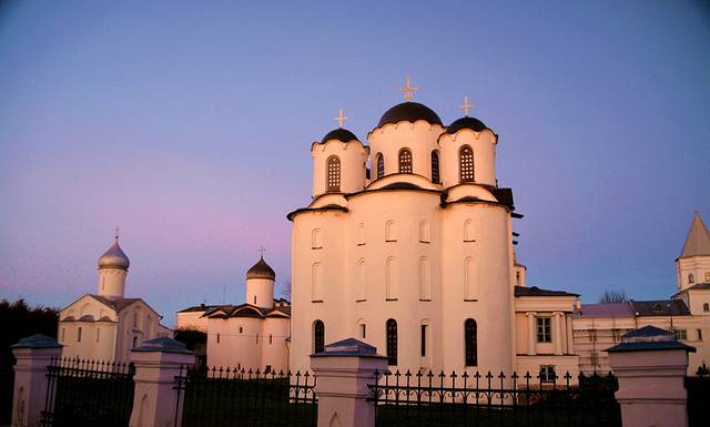 圣索菲亚大教堂从外观上看非常美丽的这座教堂,是因为画家奥凡·格列的壁画而出名。通过学术调查,人们发现在内部墙壁厚厚的涂饰下,大部分人物像都仅使用了红褐色和白色两种颜色,在极富自信的人物表情之下,还流露出一种神秘的感情。据说在创作初期,着名的壁画大师安德烈·卢布廖夫也参与了指导工作。