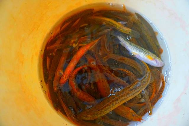 小姨看到很多人在河里抓鱼,兴趣来了停车下到河滩上观望,,结果是眼馋也着手抓起泥鳅来,表弟帮着一起捞,所以一小桶鱼虾就这么到手了!! “ 辛苦了!两位。” 作为即将成为吃客的我很真诚的说。。