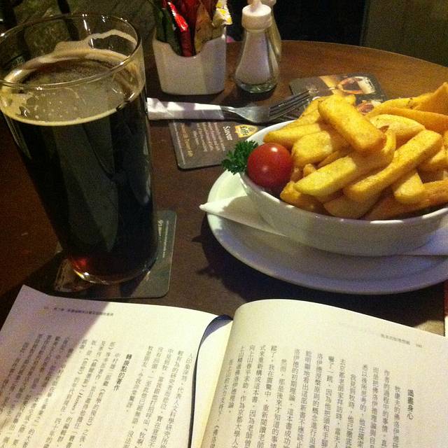 我點了杯Raven Ale和薯條,詢問酒保是否可以隨意找位子坐後,選了窗邊位子等待餐點,看著書。