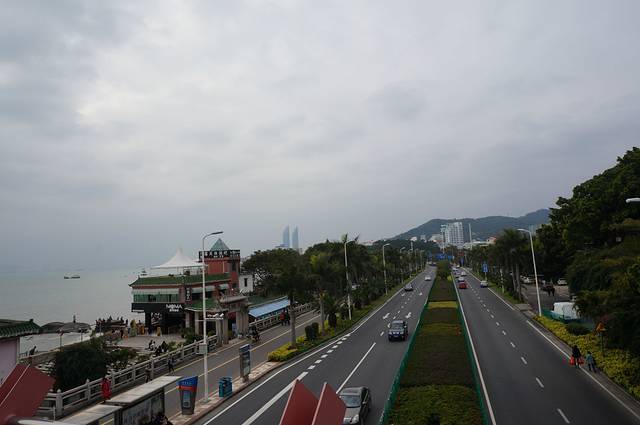 站在天桥上看环岛路。海滨城市大多差不多吧,这里让我想到青岛,也是一样绿植很多,车辆不多,空气清新。