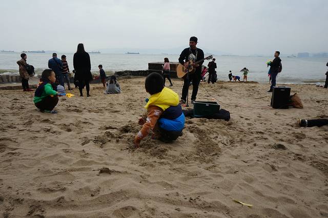 天气是阴的,气温还是13度,这张图是人最多的时候。这次虽然气温不是最舒适的,但却是在景点里看到的人最少的。小朋友一直在挖沙,而我一直在听这个歌手唱歌,歌手介绍他叫小黑,来自丽江。这个下午没有赶景点的匆忙,享受着悠闲的假期。