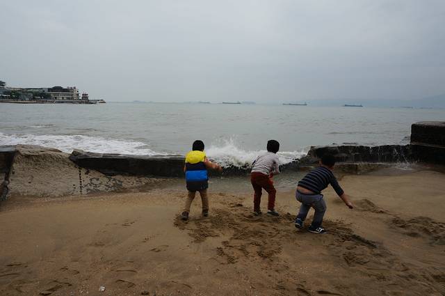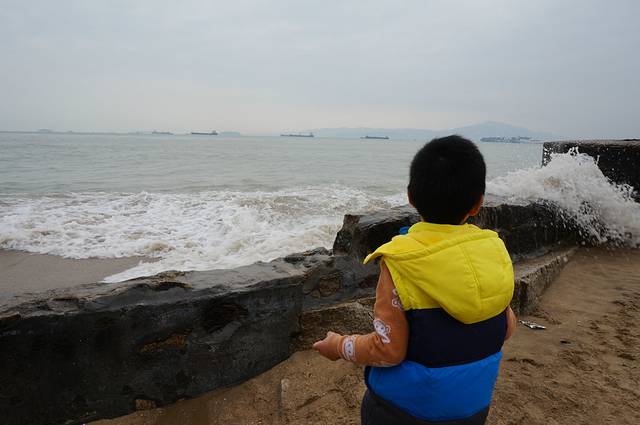 无论到哪里孩子们总是很快打成一片。最后要走时候就在这个地方小柚子直接走进了那摊海水里,鞋和裤角都湿了。