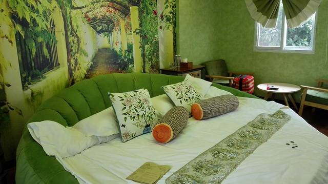 这间叫森林房,是单独的一个小二楼,没有其他房间相临,倒也清静。大圆床第一次体验,靠上面看电视还是不错的,不过想想这种床头也不能像床品一样经常清洁,倒是不太舒服,算啦,到外面就不能想那么多,让洁癖先飞一会吧。