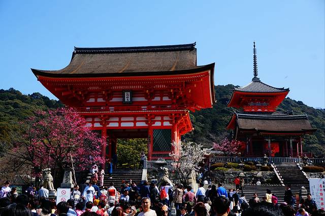 著名的樱花观赏地,可以拍到樱花环抱楼台的景象,可惜我们去的时间早,拍到了樱花花苞环抱。清水寺也是国内带团必去的地方,所以人超级多。
