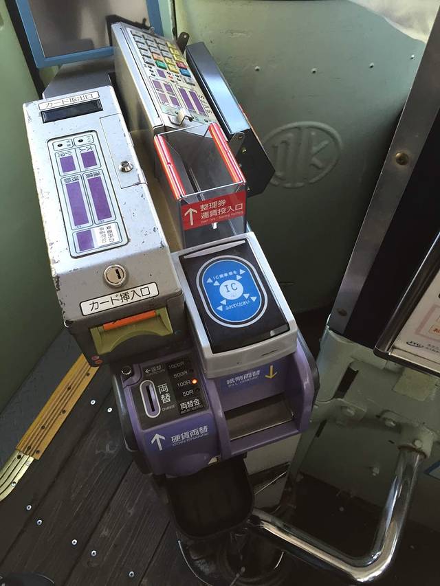 1.bus是后门上前门下。如果不刷卡的话上车的时候从一个小盒子里拿一张带有数字的整理券,司机上方有一个电子价格牌,对应你的号码在下车时交相应的硬币。