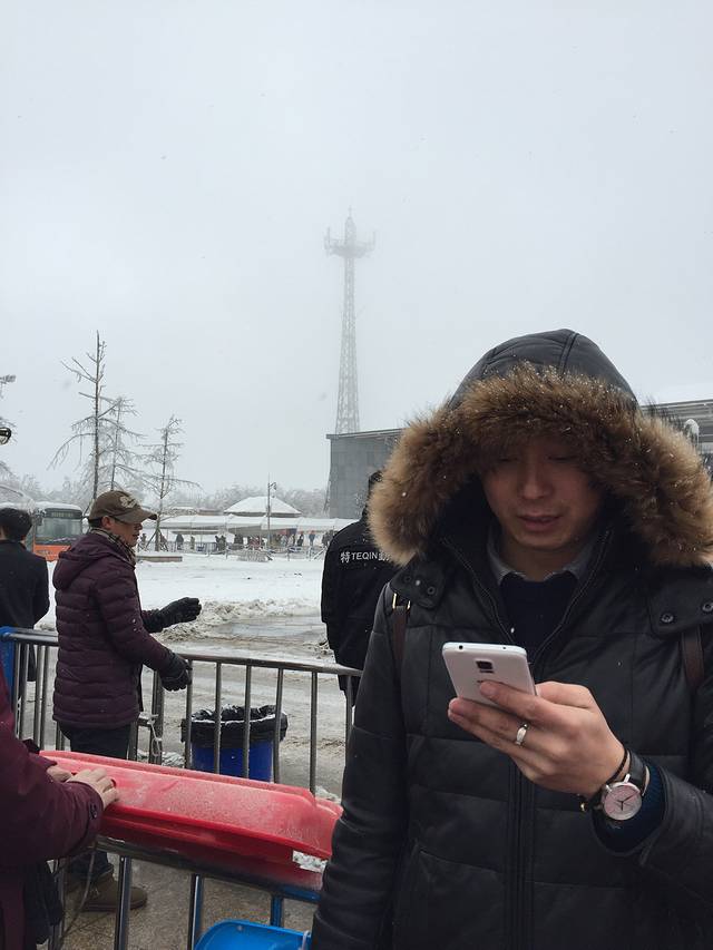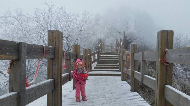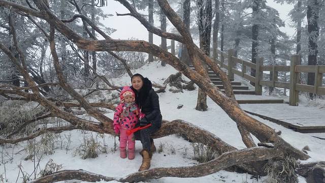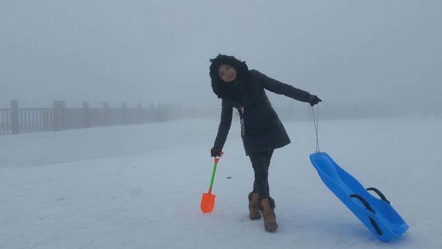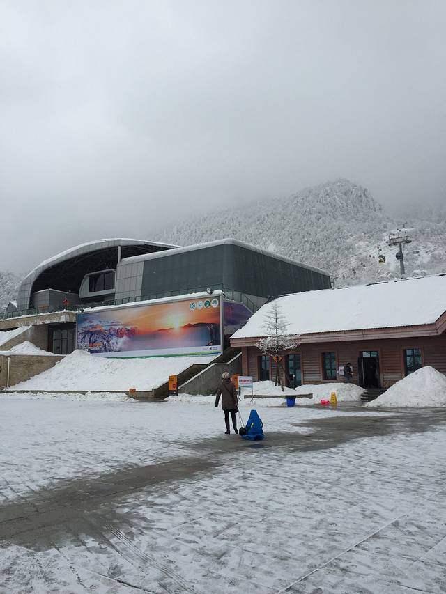 10点终于到了雪山,240的票,索道,观光车后直接到雪场。说是日月坪风光好,又花了120的索道去了,上去后天气不太好,雾蒙蒙的,下面图有标哪些是日月坪上照的。走了半个多小时,连阴阳界一半的路程都没有到,问了走回来的路人,说是天气不好,看不到阴阳界的奇观。所以我们就果断下山玩雪了。