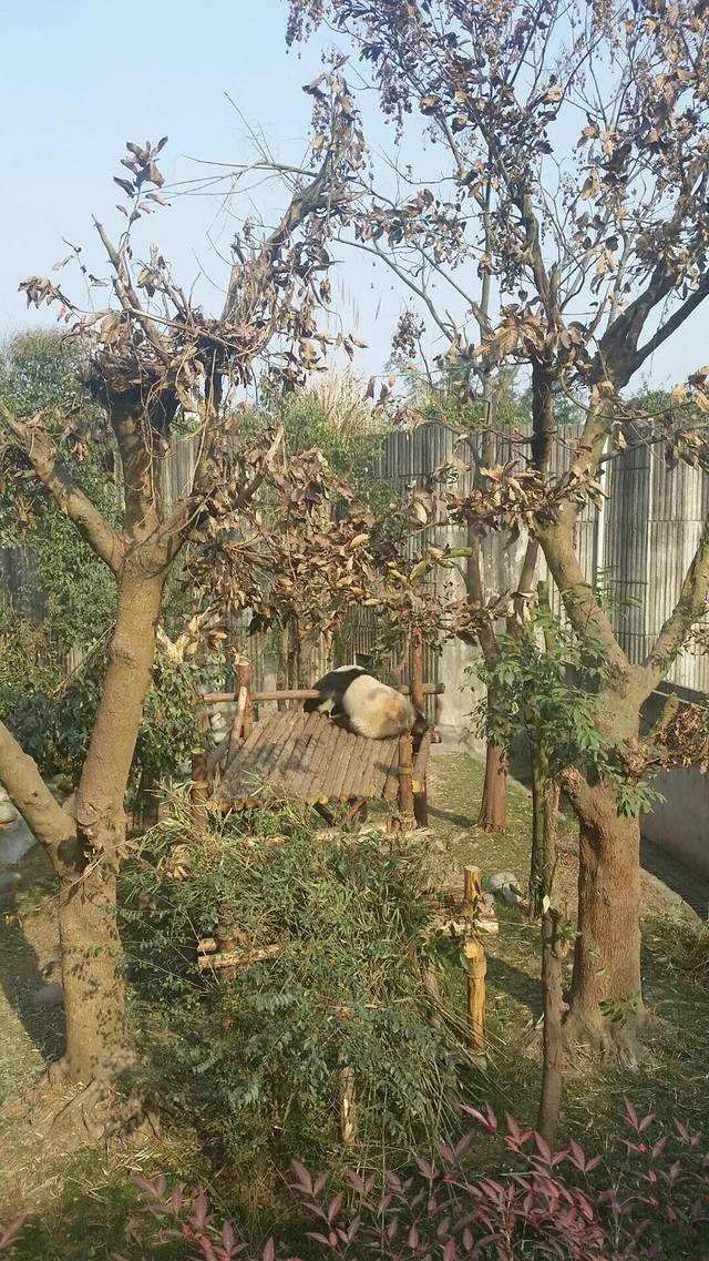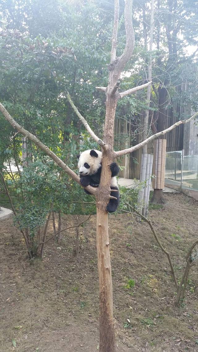 车程大概40分钟。百度了门票是58,打车的话70左右。所以还是选择这个,配讲解,还来回接送。到了以后选择坐了观光车,10元一位,一个是赶时间,一个是宝宝太重,又不太愿意走路,抱久了实在太累。熊猫非常可爱,特别是小熊猫萌萌哒……到了景点,坐观光车直接到了最远处的月亮产房,天气不错,有几只在睡觉,几只在玩,有只小熊猫爬到树上了,好担心它掉下来啊!不过看它玩得很开心……