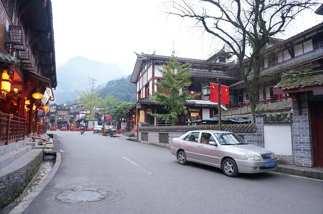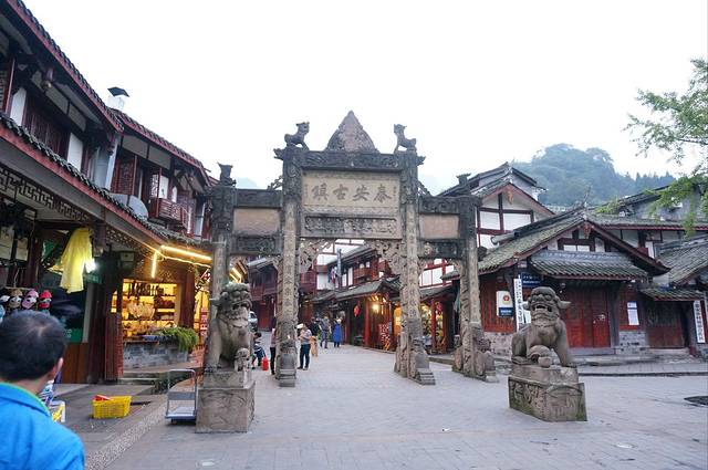 进入后山景区走不远就看到了泰安古镇,古镇主要有三条街,街上多是饭馆和住宿,价格较贵。镇上有个庙,还有条河环镇而过。整个古镇在青城后山脚下,属于后山景区内,所以进镇要先过门票收费处。