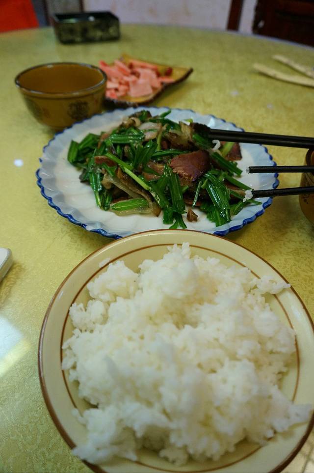 泰安特产食品一种腊肉,菜价感觉略贵,图中一盘菜+一个咸菜+一个炒野芹菜+2米饭 总共100多