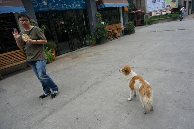鲜肉锅盔家总蹲着一只汪星人 谁买锅盔就跟着谁,我们好心给了几块肉,它一直追着直到我们进店里