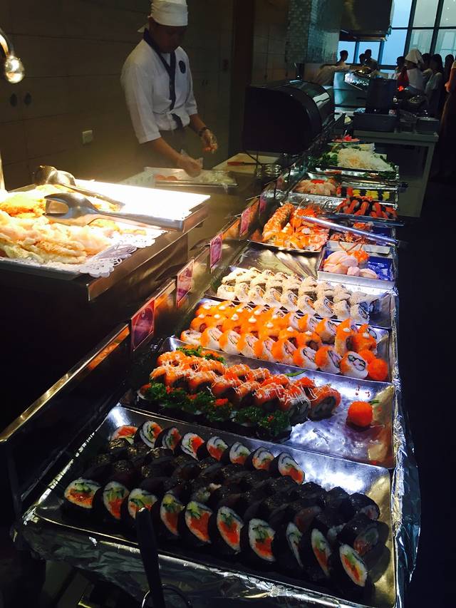我们到了餐厅时,靠近海边的位置要么已经有人要么就是reserved。正在我们纠结地找位子的时候,有个服务员告诉我们,有个位子是预留的六点,我们可以用到他们来之前。于是我们幸运地坐在了一个绝好的位置上。可惜!天气不好,不要说日落,连太阳都看不到。。
