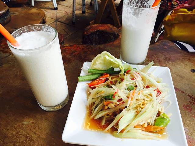 整理完行李,稍做休息我们决定去兰塔国家公园。原本准备租一辆摩托的,但我们没有骑过,酒店拒绝租给我们。前台建议我们租车,价格是1000铢包车去国家公园。如果想返程stopby就要1500。我们两考虑了下,决定先去找个711买点东西再说。711在市集还是挺多的。但是我们酒店在比较北边。前台告诉我们往北走有一家,还木有走到我们就在路边的一个店子开启了泰国的第一餐。