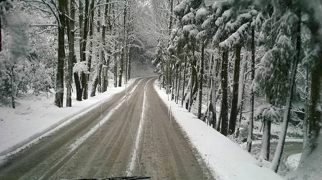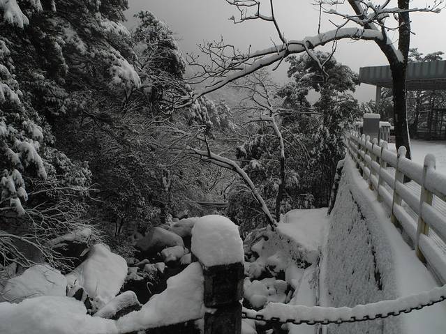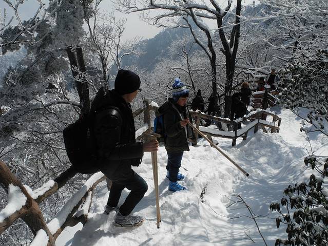 早餐后,在酒店或附近超市买好拐杖、钉鞋和鞋套(这个是必须的)、干粮(山上不是一般的贵价),武装好后变可以出发了。最好8点多出发,因为第一天的行程比较远。到换乘中心后坐大巴约20分钟便可至云谷索道站,从后山而上。(当然,也可以坐玉屏索道上山,这是前山。换乘中心分别有车到达两个索道。但是,后山上山比较平坦,前山上山则以爬坡为主。)车开出约摸几分钟,车上已经是哇”声一片,想必大家已经猜到发生什么事了。