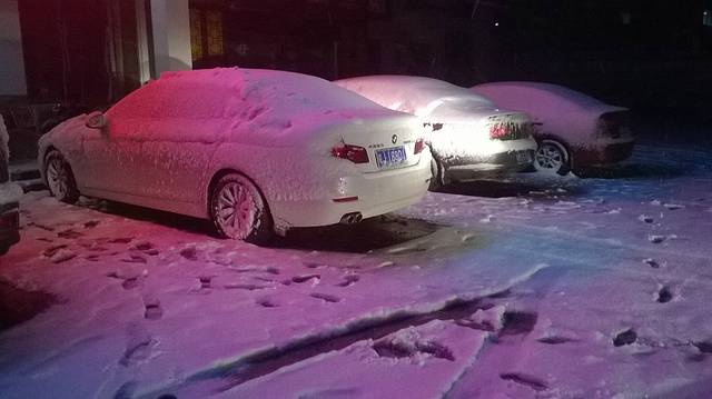 刚下飞机就见到雪花飘飘,接车师傅说汤口那边雪已经很深,快到的时候车还得装上防滑铁链。这一听,把我兴奋得不行。随着车一步步靠近汤口,雪真的越来越大,路面、路牙、树木上的雪堆积得越来越厚。一个小时后到达酒店,门口的小汽车已完全变成了白色,房屋也被覆盖。在我办理入住手续时,儿子已经迫不及待地和老婆玩起了雪仗。