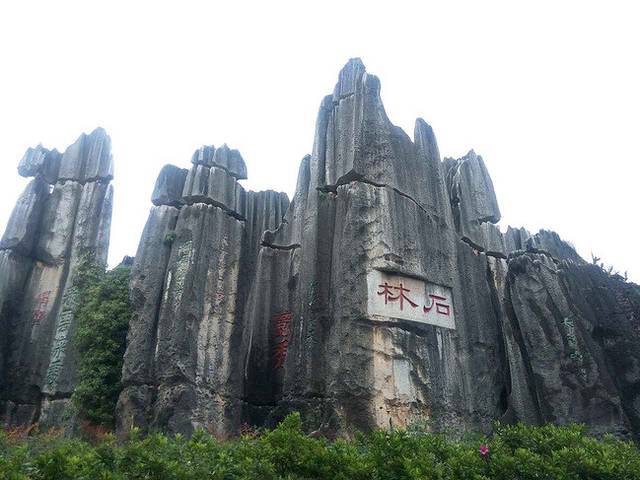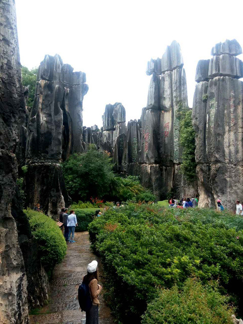 本来觉得都是石头,没有什么感兴趣的东西,所有也没准备拍照,但是去了发现,真的不一样。在石林景区行走,看着那两亿年前的奇石利仞如天然的森林一样伫立在这片安静的土地上,看着那经过两亿多年沧海沧田变化和雨水海水冲刷而锋利如剑的石峰,看着那没有经过任何人工雕饰却自成一趣的可爱石头,每一个经过它的人都会为它的奇丽壮观所触动,都会为大自然的鬼斧神工所折服。在大石林有个亭子,算是景区的最高点,也是看石林的最佳去处,应该是叫望峰亭吧。天空中洁白的云层中也开始沁出一抹一抹清澈的蓝。真美。不同类型的美融合在一副画卷里,让人真的忍不住呐喊。那就呐喊吧,用一声长长的呐喊,喊出你心中的震撼,喊出你对造物主深深的敬意。园区的带队阿诗玛说石头其实就是三分长相,七分想象,但是我觉得七分长相也不为过。