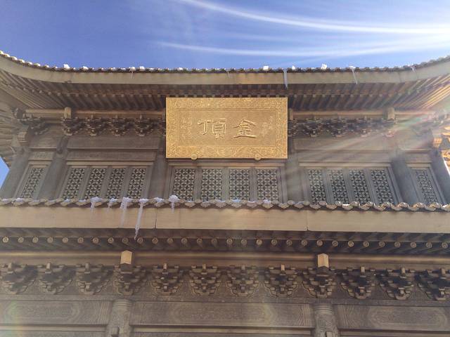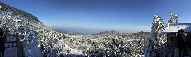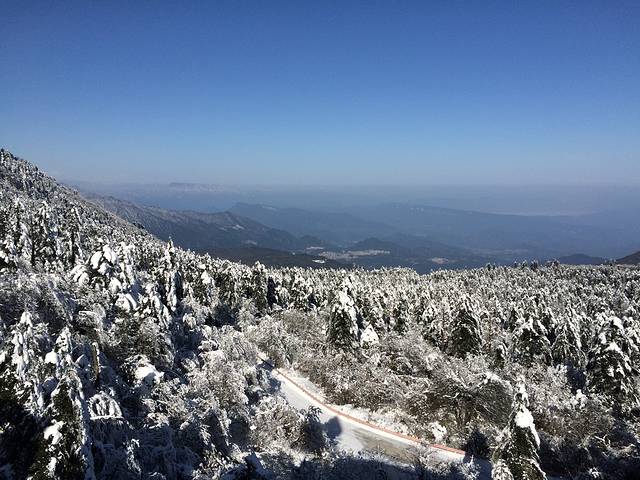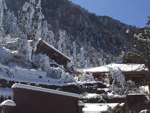 这趟旅程一个重头戏就是峨眉山了。我们运气特好,在除夕登山,游客稀少,而且老天爷特给面子天气晴朗,前一夜还下了一场雪,蓝天白云,雪山森林美景尽收眼底,虽然我们开车直达零公里停车场,再转旅行车到雷洞坪,雷洞坪到接引殿缆车段还是得自己爬上去,积雪较厚,爬山过程很吃力,有点担心老人小孩吃不消。但沿途美景令家人不断拍照玩乐,四位老人和小孩也可以顺利登山,的确旅途愉快是最有力的强心剂。