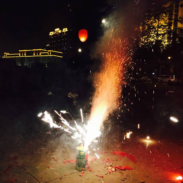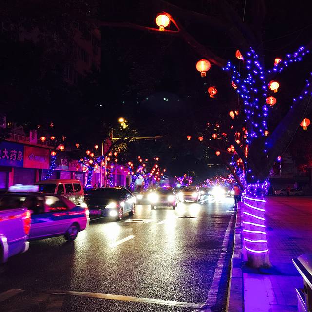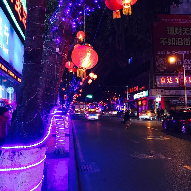 吃完烤鱼继续逛城区 城区里过年的感觉很足 几乎每条路上的树上都挂了灯和灯笼 远远望过去红色的一片非常喜庆