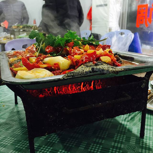 先是挑鱼然后烤好端上来吃 吃的差不多了可以加素菜继续吃 和武汉的小张烤鱼差不多 只不过是菜后来上的区别