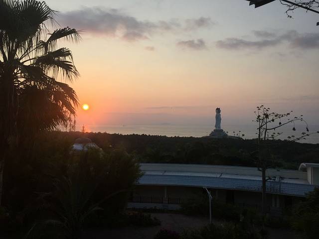 晨起的朝阳和窗外的南海观音