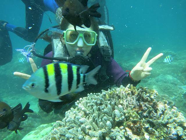 我在潜水~各种动植物看的好清楚''鱼在眼前晃''珊瑚好软''一碰还会动