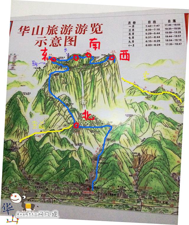 玉泉院到北峰我们走了3个半小时,北峰一直到西峰要四个小时;黄色是索道,其实最美的景色是在北峰到西峰那一路,很多小朋友老人家也有爬上去的,真厉害。