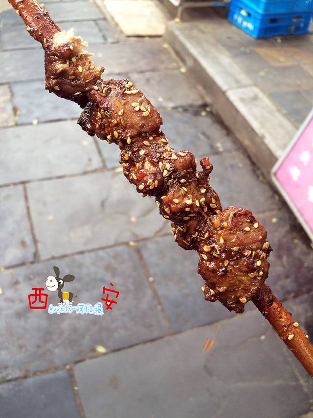 回民街里很多这种烤羊肉的摊子,价格不便宜,10元一串,我俩一个来一串,快吐了都,好膻啊,吃了很久嘴里还是那个味道,不好意思真的不喜欢这个味,如果把膻味去掉就好了。还有一个问题是严重怀疑这些棍子是回收利用的。