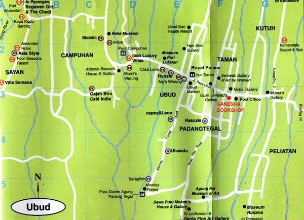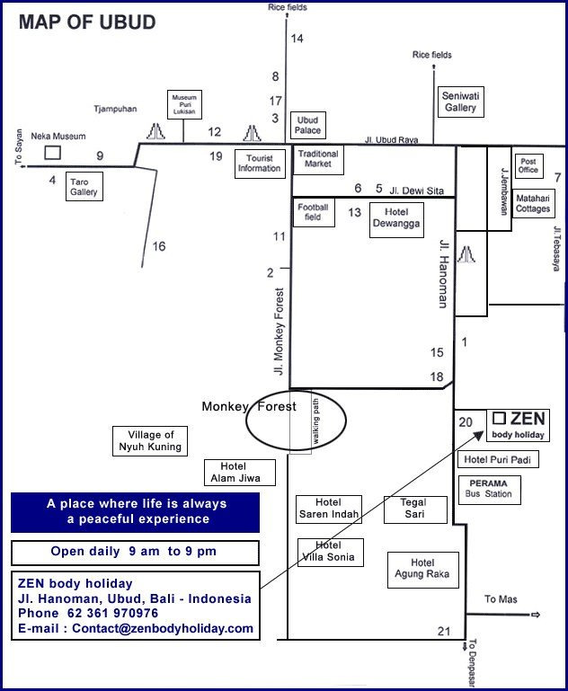 乌布市区的路其实很好认,游客常去的主路是JR路( Ji Raya Ubud)。地图上看是横着的那条,东西方向。这条路的中心路段已经变成了步行街,禁止车辆通行。最好是可以租摩托车,50.000Rp/辆/天,汽油自己加,20.000Rp可以加满。骑摩托注意靠马路左侧行驶,不会有人偷车,步行街区域停车会有人收停车费,5.000Rp/辆。骑摩托车一定要慢速行驶,拐弯的时候注意减速,这里马路窄,车子特别多,如果路开过了要调头,很麻烦也很危险,因此建议开车的先熟悉乌布市区地图。