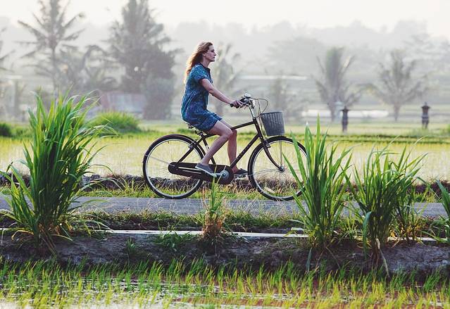 《Eat, Pray, Love》剧照,女主角骑着单车,自由自在地穿行在乌布的水稻梯田之间。