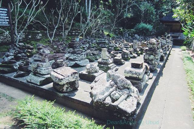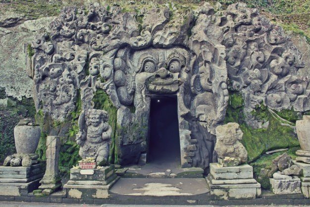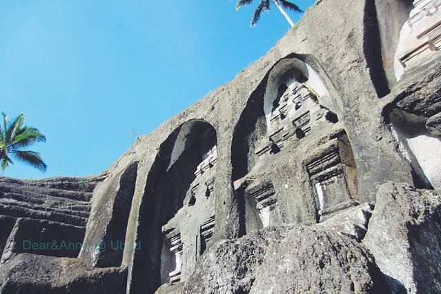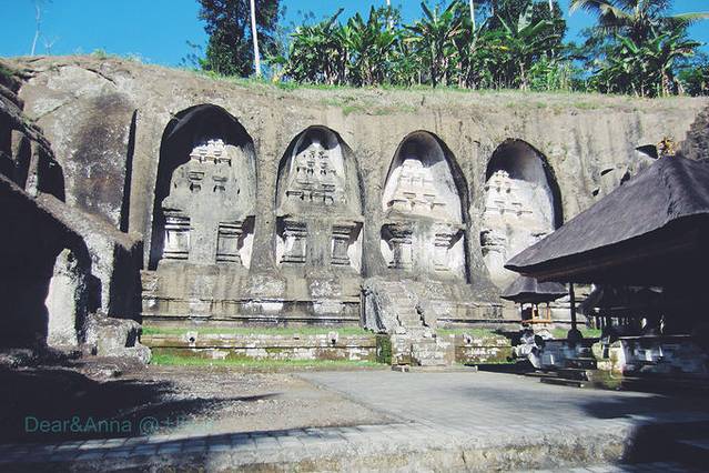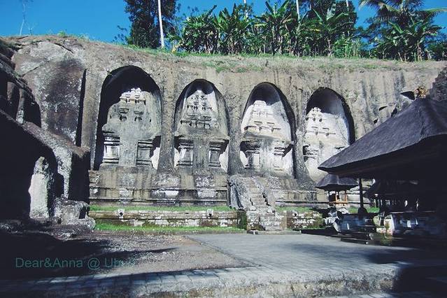 在郁郁葱葱的河谷深处,有十座岩石雕凿的神殿,岩面凿出的雕像栩栩如生,令人敬畏,高达8米。据说,这些石雕是为了纪念巴厘岛最为古老的王室成员,国王,王后,嫔妃,大臣等等。是由巨人Kebo Iwa一夜之间,仅用指甲在岩壁间开凿出来的,对于这些流传,是否属实也从记录。