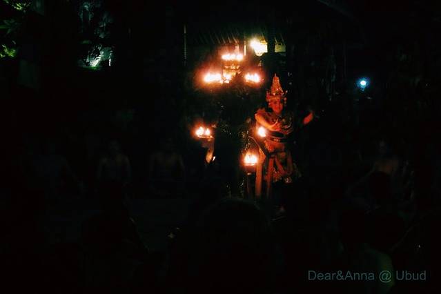 我们买了七点半的克差舞,演出的地点也离乌布皇宫不远,是在寺庙内的露台演出。骑摩托十五分钟,我们着实找了好久。虽然门票上印有地址和地图,但是到了所在的那条街上,黑灯瞎火,没有门牌号,还是得问问路人才知道。当然,如果你已经离它不远,单凭道路两旁停满的摩托车辆和热闹的人群,就可以辨识演出的场所了。