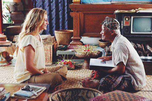 《Eat, Pray, Love》剧照,女主角拜访巴厘岛传统治疗师的情景。治疗师家中地上放满了做好的贡品。