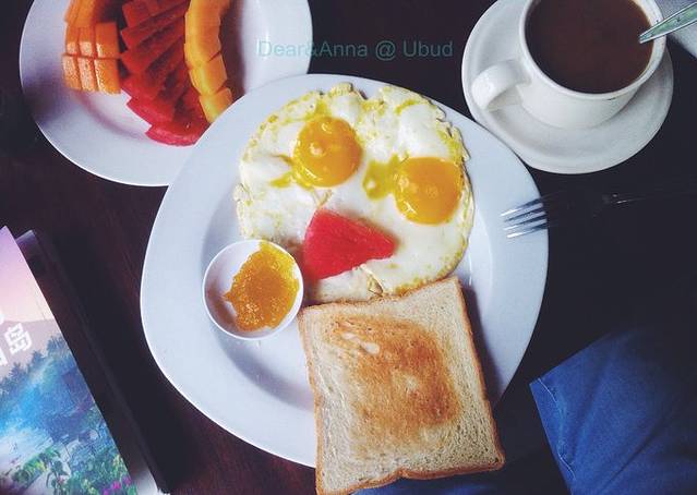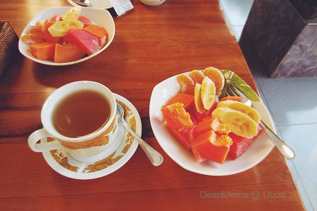 Putu的妹妹给我们摆好茶具,道上温婉的红茶。在抿了几口茶水后,她又细心地端上烤吐司,煎蛋,火腿,果酱,以及各种各样的切成片的水果,西瓜,哈密瓜,火龙果,橙子,木瓜。