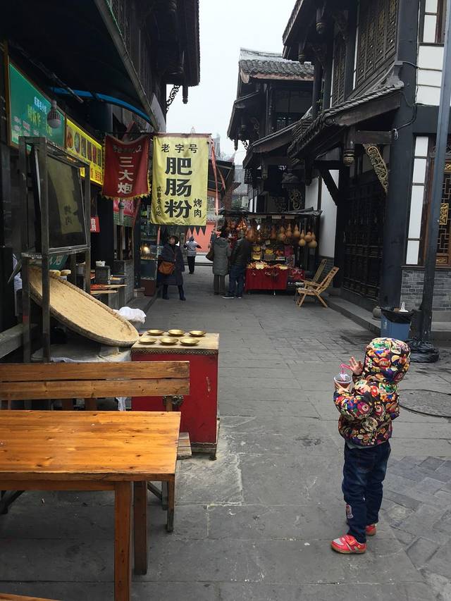早晨从文殊坊出发到宽窄巷子漫步,真的是想在这里看一场川剧,碍于小诺对“带面具,就是画着脸谱的人,害怕的不行”,我们只能放弃了,本来已经走进“成都印象”打算边在这里吃饭边看一楼的川剧表演,被几乎要哭的小诺硬拉了出来~~~~中午成都老字号铜人李火锅店吃成都正宗麻辣火锅~~~午后人民公园百年鹤鸣茶社喝盖碗茶(期间小诺童鞋困的不行,直接倒在爸爸肩上睡着了,小家伙感叹,麻麻怎么一睁眼到锦里了:)。下午锦里品各种美食小吃----铁板肥肠口水直流哦,老公更是卖力“媳妇,吃,想吃什么,咱吃够了再走”。以至于没有赶上游武侯祠的时间 只能在大门外驻足。