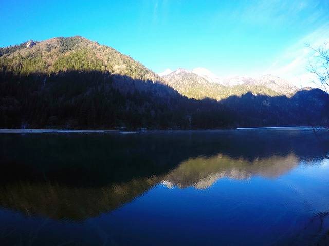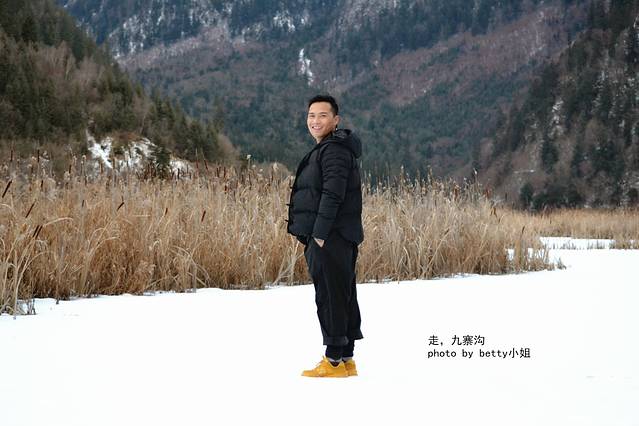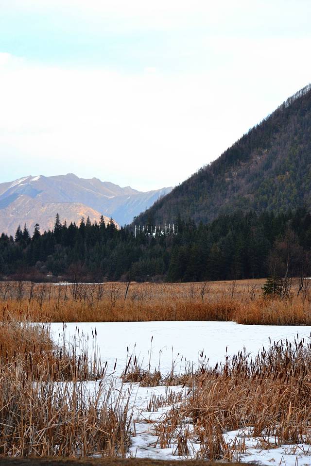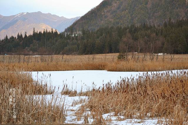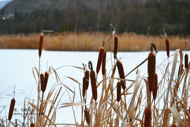 然后就遇见了这个海子,已经忘记他的名字了,就在前往九寨沟的路上,因为寒冷,这个湖面结了冰,有薄薄的白雪覆盖,芦苇已经变成黄色,却也是别有美景~