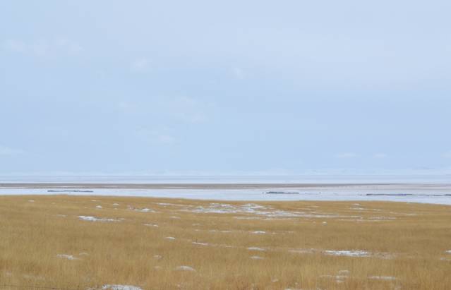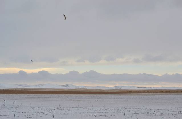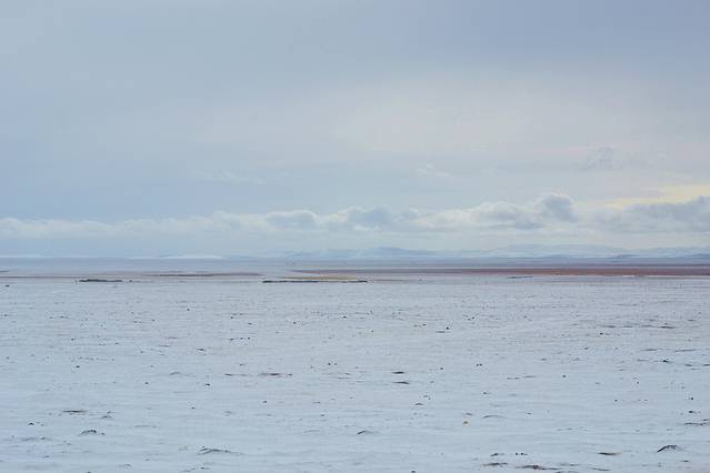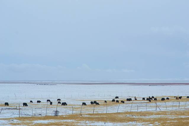 这一路经过无数草原,海子,湿地,冬日大雪中的大地一片安宁,白雪覆盖着枯黄的草地,苍茫茫的天地间,牛羊仍在大雪中安详的吃草,全没有夏天时的喧嚣(一路过去有很多帐篷,各种雪域饭店等为吸引顾客的广告牌,想必夏日旺季的时候,一定是一片欣欣向荣的)往来的车辆少之又少,而我们反而是打搅他们的外客,好在地域广阔无垠,我们这点笑声大概也惊扰不到谁。