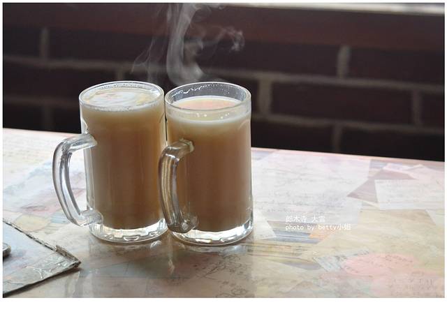 逛完这两个诺大的寺庙,我们也是又冷又饿,虽说很多店都歇业的,但是在寺门口看到了一家藏族餐馆就直接进去吃东西了,点了两杯酥油茶,本来也很想尝试下青稞酒,可惜开车不能喝酒呀~~