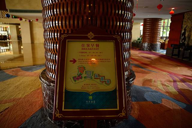 贴心的为住店客人写明早餐的用餐时间和费用【住店客人的房费是包含早餐的,在宴会厅用餐】。