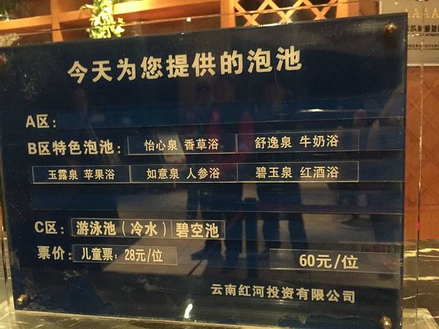 上面的价格是平日价,周五到周日成人是80元/位,春节、黄金周是128元/位。各个浴池的名字不一样,功效也大不相同,客人可以自由选择。